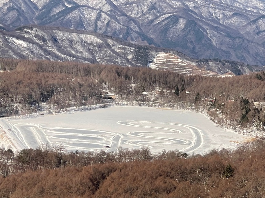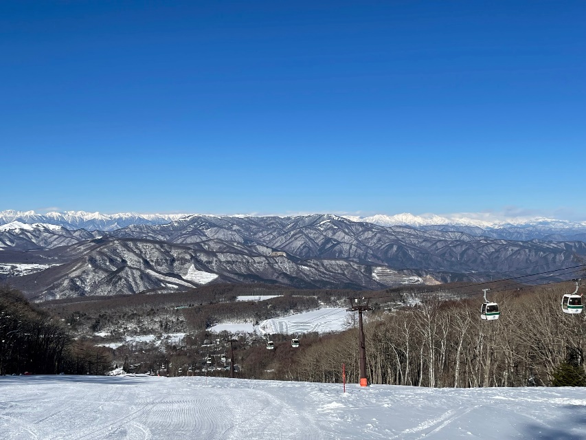 眼下の女神湖と中央アルプス、北アルプスを望みながらの滑走コースは快適。