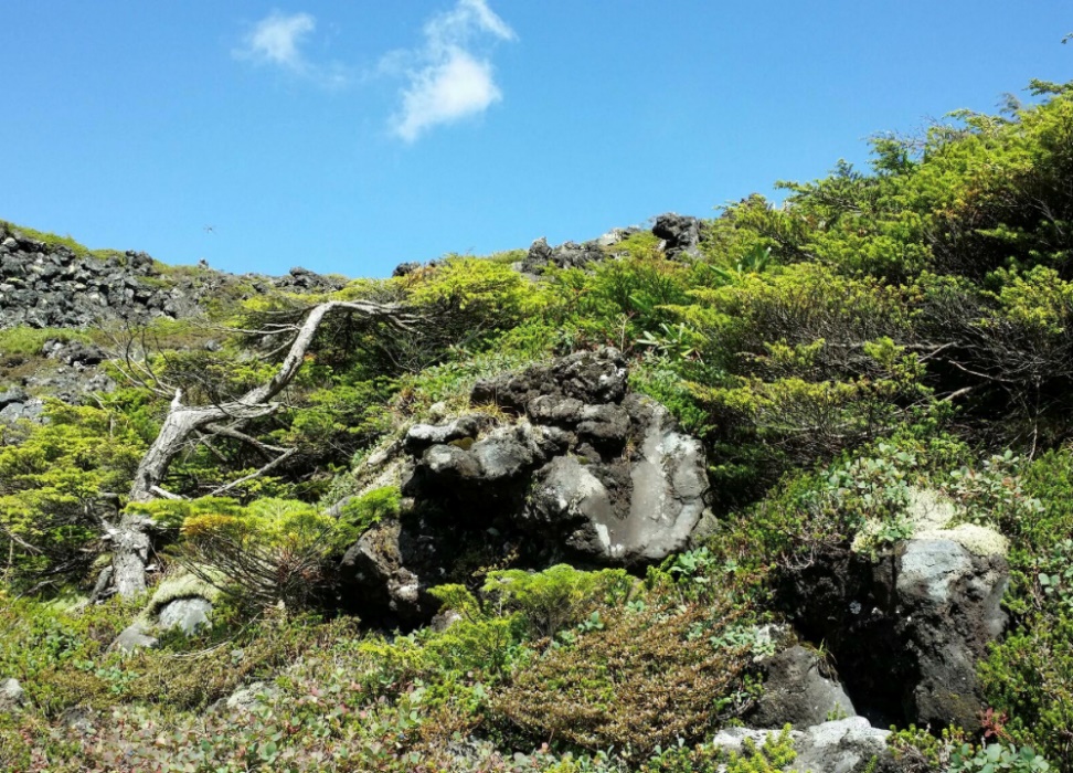 山頂には、ハイマツやコメツガなど溶岩台地を覆う低木や高山植物が 群生する坪庭自然園が広がります。