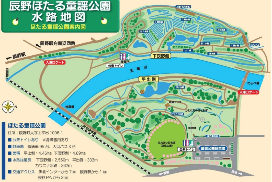 ゲンジホタルが生息しやすいようにと水路を張り巡らせた「ほたる童謡公園」があり、夏の夜には無数のホタルが乱舞する幻想的な光景を楽しめます。