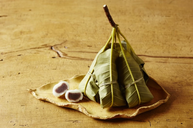 朴葉巻きは、餅にあんを包み朴葉でくるんで、い草で縛り蒸しあげる。