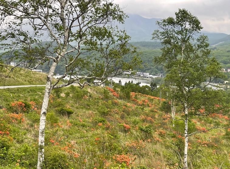 白樺湖を見下ろせる場所からは、空と湖の青さとレンゲツツジの赤の対比が見事です。