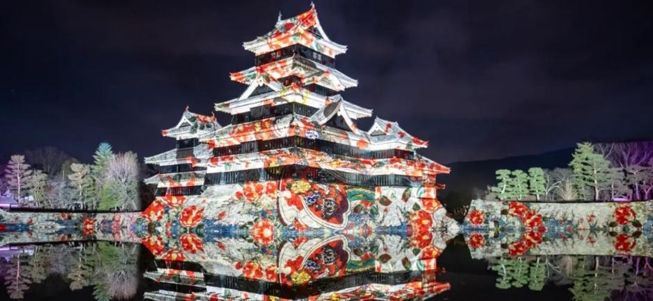 現存国宝5天守の一つで五重六階の天守の中で最古の国宝 松本城の天守や石垣に、松本市立博物館所蔵の商都松本が描かれた錦絵、絢爛豪華な屏風絵、松本てまりや提灯など松本市ならではの伝統工芸のモチーフ、春に咲き誇る桜や北アルプスの花々など、ダイナミックで幻想的なプロジェクションマッピング映像を投影します。